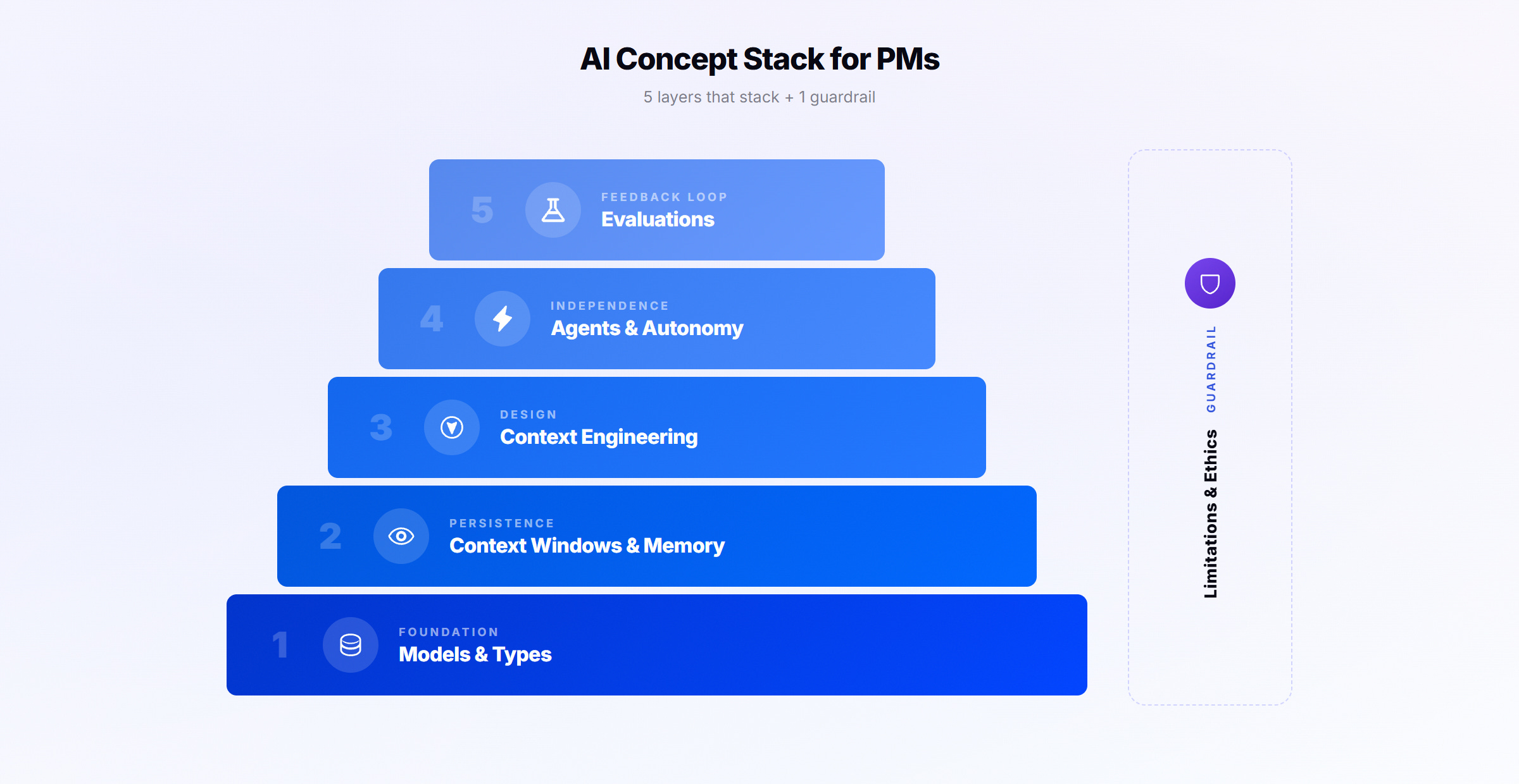 That boils down to six concepts. And they have a logic that isn’t obvious: the first five stack. Each layer needs the one below to work well. The sixth is a guardrail that applies across all of them.
